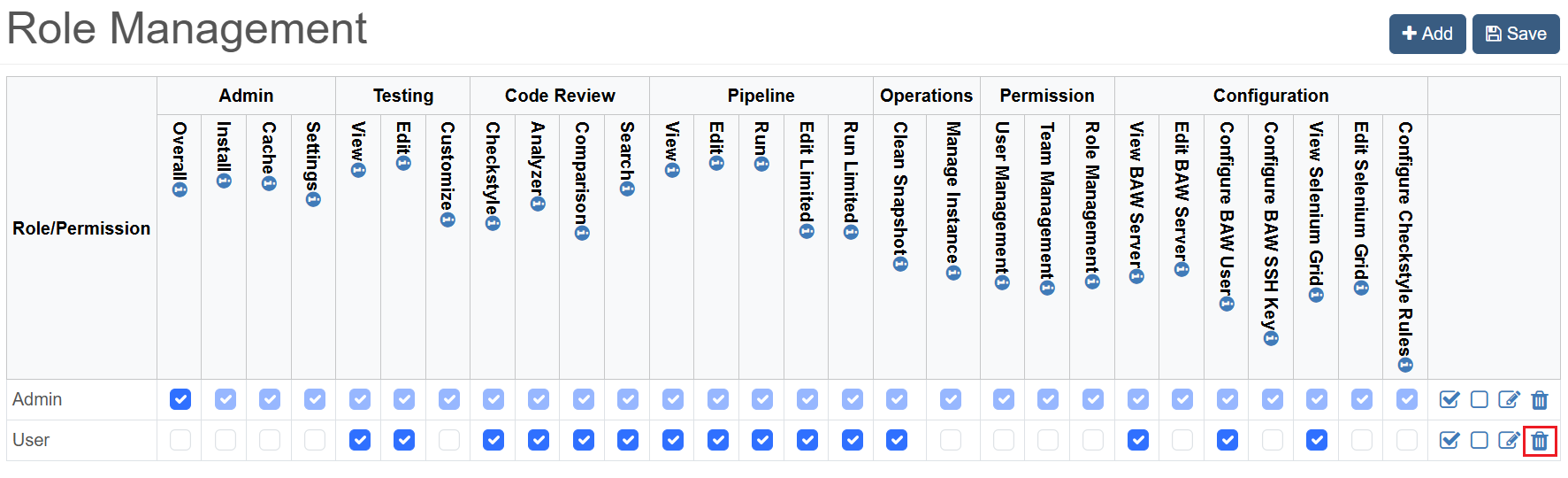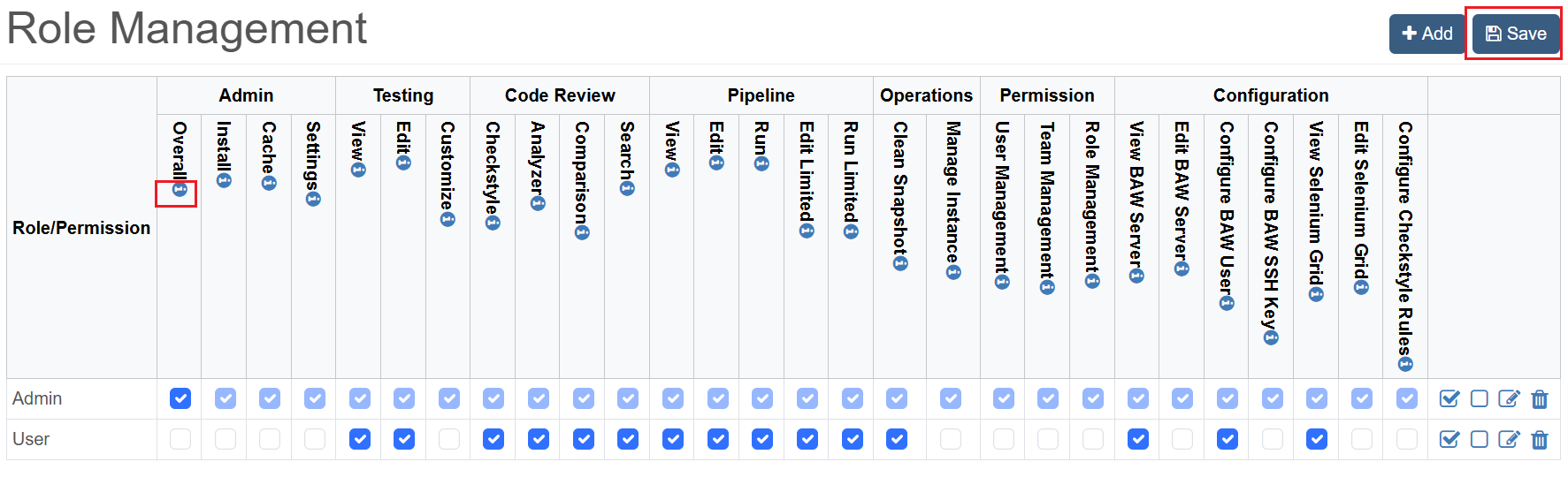 Check/uncheck permissions in the Role Management table, then click the Save button to update role permssions. The permissions are categorized into “Admin”, “Testing”, “Code Review”, “Operations”, “Permission” and “Configuration”. Hover mouse over the Info icon of each permission, to view description of the permission.