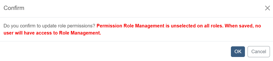When Role Management permission is removed from all roles, a warning message will show up, as if this permission is removed from all no user will be able to access the Role Mangament page.
